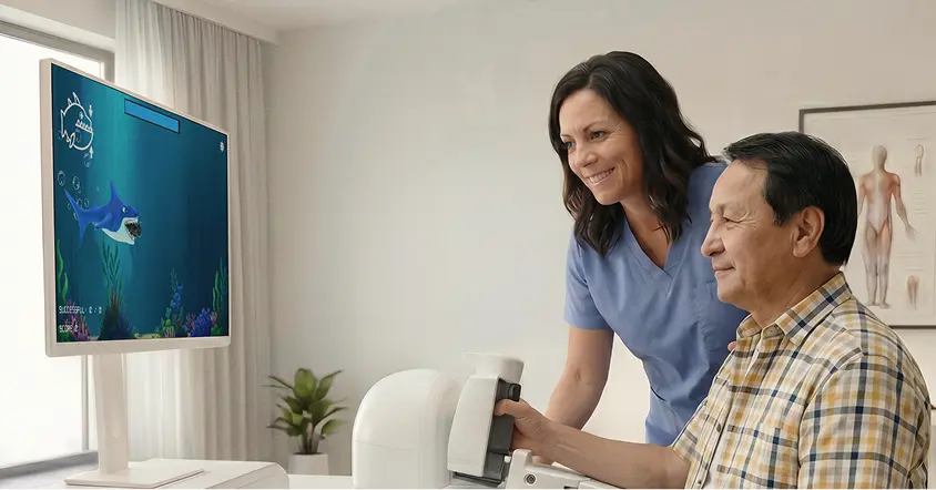 - Movements are automatically scaled to each patient’s functional capacity, allowing even limited-range patients to actively participate.